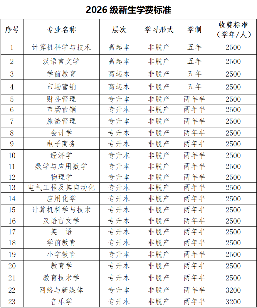 2026级新生请于2026年1月6日-1月16日完成学费缴纳。之后每年学费在1月春季开学前统一通过线上方式缴纳当年学费。学校计财处将统一打印收费票据,凭缴费截图到继续教育学院教务科领取收费票据。